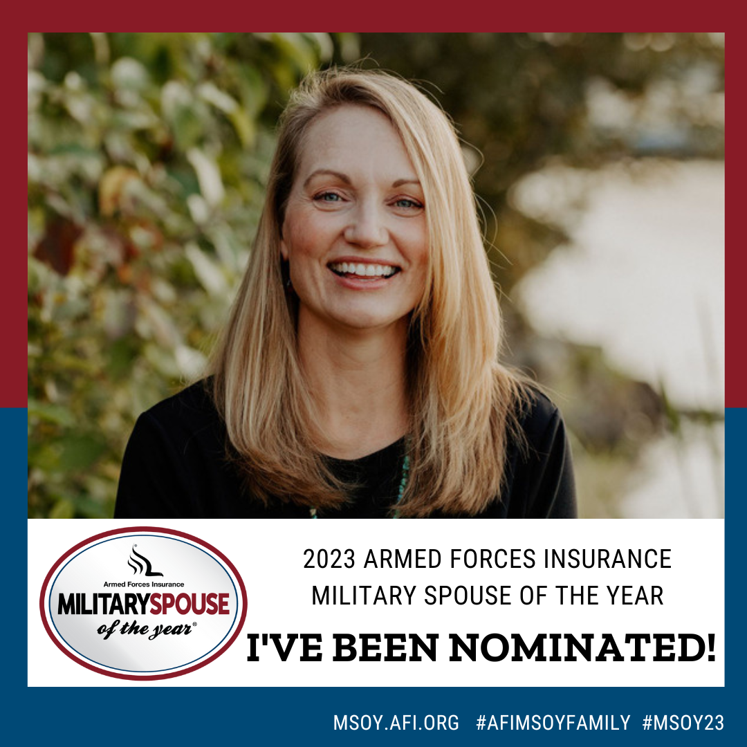 I’m thrilled to announce I have been nominated for the Armed Forces Insurance Military Spouse of the Year Award. The Armed Forces Military Spouse of the Year (AFI MSOY) award was founded in 2008 to honor military spouses from all branches of service and the countless ways military spouses contribute to and strengthen our military community.